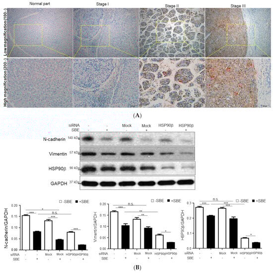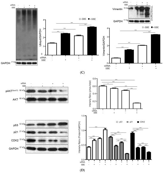 (A) Immunohistochemical study of HSP90β expression in adjacent normal part, stage I, and stage III of HCC tissues. The positive signal is presented in brown (bar scale 200 μm) and nuclear HSP90β is indicated by red arrows. (B) SK-Hep-1 cells were treated with or without 250 μg/mL SBE and siRNAs of HSP90β. Levels of EMT related protein such as N-cadherin and vimentin as well as HSP90β were measured by Western blot analysis. GAPDH was used as an internal control. The quantified results were indicated by the bar chart (* p < 0.05, ** p < 0.01, *** p < 0.001, n.s. indicated no significance). Results represent the means ± SD of three independent experiments. (C) SK-Hep-1 cells were treated with or without 250 μg/mL SBE and siRNAs of HSP90β modulated vimentin ubiquitination. Proteins were isolated from cells and the levels of ubiquitination as well as ubiquitylated vimentin were detected by Western blotting (*** p < 0.001). (D) Combined application of 250 μg/mL SBE and siRNAs of HSP90β inhibits activation of the AKT signaling pathway. The expression levels of AKT, p-AKT Ser473, p53, CDK2, and p21 in total cell lysates were detected by Western blotting (* p < 0.05, ** p < 0.01 and *** p < 0.001, n.s. indicated no significance).