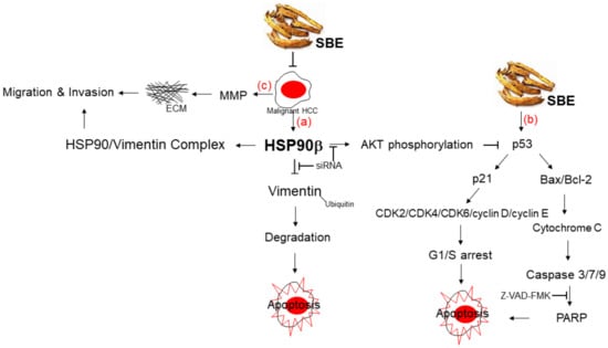 The current study provides evidence that the molecular pathways underlying SBE-mediated alleviation of advanced HCC are listed as follows: (a) The application of SBE could simultaneously modulate HSP90β levels, thus inducing the degradation of vimentin to abolish the EMT of SK-Hep-1 cells and promoting apoptosis to prevent the progression of HCC. Meanwhile, abrogation of HSP90β due to SBE treatment inhibited AKT phosphorylation and, in turn, suppressed the expression of cyclin D, E, and CDK2/4/6. (b) Over-expression of p53 resulted in Bax/Bcl-2 translocation and cytochrome c release, subsequently leading to caspase-3-7-9-dependent apoptosis under SBE exposure. (c) Additionally, SBE administration also inhibited MMP activity and arrested the migration/invasion of SK-Hep-1 cells (Figure 7).