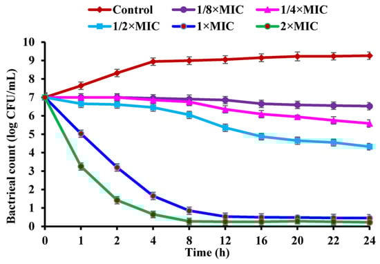Antibacterial kinetics assay was used to assess antibacterial mechanism of CBLEO on S. aureus (the most susceptible strain) []. In order to increase CBLEO solubility, the stock CBLEO was prepared in 4% dimethyl sulphoxide (DMSO) [] to obtain five different doses (1/8×MIC, 1/4×MIC, 1/2×MIC, 1×MIC, and 2×MIC) and then was added into 100 mL of bacterial suspension (107 CFU/mL). After incubating for 3, 6, 9, 12, 15, 18, 21, and 24 h, the collected suspension was used to detect optical density (OD) at 600 nm by ultraviolet spectrophotometer (Agilent Cary 3500, Agilent, Santa Clara, CA, USA). The growth kinetic curve of S. aureus was elaborated by drawing the lg number of CFU/mL versus incubated time [].