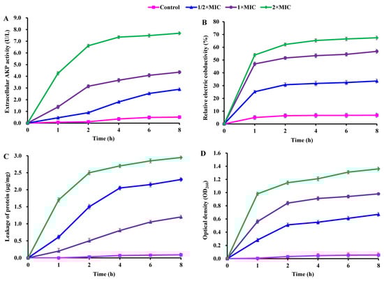 The impact of CBBLEO on cell wall damage of S. aureus was analyzed by detecting release of alkaline phosphatase (AKP) []. Different doses (1/2×MIC, 1×MIC, and 2×MIC) of CBLEO were added into S. aureus cells (107 CFU/mL) and incubated at 37 °C, and then the supernatants collected at different times (0–8 h) were used for the detection of AKP activity by commercial kit (RS0904F, Redshineen Biotech, Guangdong, China). The AKP activity was standardized to the used amounts of S. aureus cells, and the result was expressed as U/L.