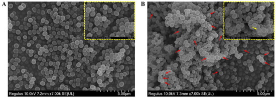 The membrane integrity of S. aureus cells was evaluated by detecting the leakage of intracellular nucleic acid and protein []. S. aureus cells (1 × 107 CFU/mL) were incubated at 37 °C with CBLEO at different levels (1/2×MIC, 1×MIC, and 2×MIC) and times (0–8 h), and the samples were collected at different times. After centrifugation (10,000 rpm) at 4 °C for 10 min, the supernatants were used to detect the amounts of nucleic acid and protein by using ultraviolet spectrophotometer (Agilent Cary 3500, Agilent, Santa Clara, CA, USA). The detected result of nucleic acid was expressed as the absorbance value at 260 nm (OD260), and the amount of protein was standardized to the used amount of S. aureus cells (μg/mg).
