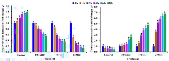 Another concern was whether CBLEO shows anti-biofilm activity against S. aureus. A dose/time-dependent decline pattern was noted for biofilm biomass in S. aureus cells exposed to CBLEO, of which the reduction in biofilm biomass was 43.64%, 63.75%, and 85.42% after 8 h of exposure to 1/2×MIC, 1×MIC, and 2×MIC, respectively, but the increased biofilm formation was observed for the control (Figure 5A), emphasizing that CBLEO had a good anti-biofilm effect on S. aureus. It was also noted that the biofilm formation decline was highly associated with protease production []. Compared with biofilm biomass (Figure 5A), the protease activity exhibited a dose/time-dependent increase in S. aureus subjected to CBLEO, while a decrease in protease activity was detected for the control (Figure 5B), indicating that the CBLEO-induced low capacity of biofilm formation may be associated with an increase in protease activity.