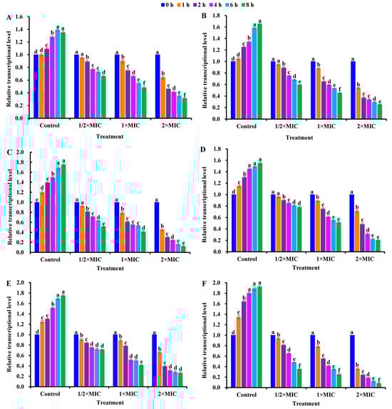 Effect of CBLEO on transcriptions of virulence-associated regulators of S. aureus under exposure to different concentrations and times by qRT-PCR detection. (A) Relative transcription of agrA (accessory gene regulator A); (B) relative transcription of sarA gene (staphylococcal accessory regulator A); (C) relative transcription of sigB (sigma factor B); (D) relative transcription of icaA (intercellular adhesin A); (E) relative transcription of cidA gene (encoding for holin); (F) relative transcription of rsbU (SigB activator). Relative expression values were counted as 2−ΔΔCt, and 16S RNA was used as internal control. Transcription level in S. aureus cells from control and CBLEO-treated samples with different concentrations at 0 h was arbitrarily set to 1.00 for standardization. Data represent mean value ± SD of three parallel replicates, and different letters denote significant differences (p < 0.05).