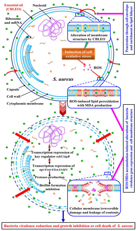 Together, CBLEO-mediated oxidative stress and ROS accumulation may be the primary driver of the cell membrane damage of S. aureus. Yet, little attention has been paid to the cross-talk between oxidative stress and virulence-associated factor expression required for biofilm formation during the exposure of bacteria to the essential oil.