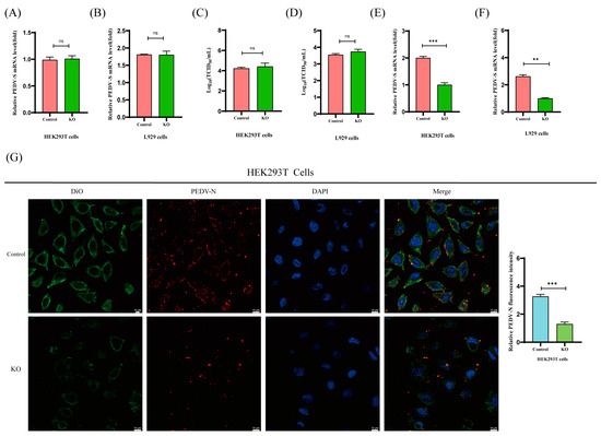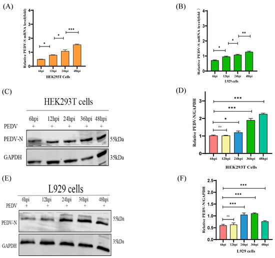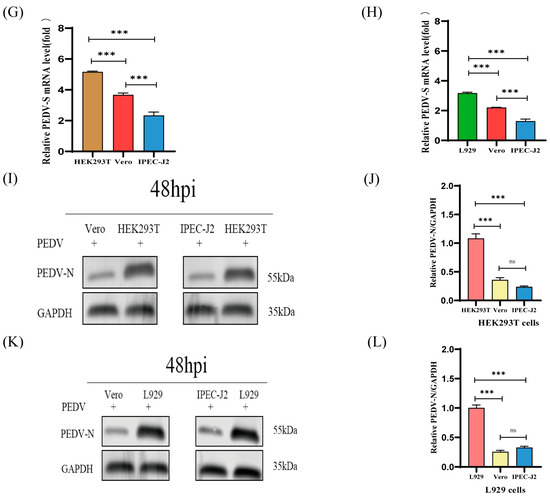 Susceptibility of different cell lines to PEDV infection. HEK293T and L929 cells demonstrate higher susceptibility to PEDV infection than Vero and IPEC-J2 cells. (A) The infectivity of PEDV (MOI = 1) in HEK293T cells was analyzed by measuring PEDV-S RNA levels at 6, 12, 24, 36, and 48 hpi using qRT-PCR. (B) The infectivity of PEDV (MOI = 1) in L929 cells was analyzed by measuring the levels of PEDV-S RNA at 6, 12, 24, 36, and 48 hpi using qRT-PCR. (C,D) Western blot analysis of the infectivity of PEDV (MOI = 1) in HEK293T cells by measuring the levels of PEDV-N protein at 6, 12, 24, 36, and 48 hpi; changes in the PEDV-N/GAPDH ratio were quantified using ImageJ software version 1.57 and plotted. (E,F) Western blot analysis of the infectivity of PEDV (MOI = 1) in L929 cells by measuring the levels of PEDV-N protein at 6, 12, 24, 36, and 48 hpi; changes in the PEDV-N/GAPDH ratio were quantified using ImageJ software version 1.57 and plotted. (G,H) qRT-PCR analysis of PEDV-S RNA levels at 48 hpi to determine susceptibility to PEDV infection (MOI = 1) in HEK293T, L929, Vero, and IPEC-J2 cells. (I,J) Western blot analysis of the levels of PEDV-N protein at 48 hpi to determine susceptibility to PEDV infection (MOI = 1) in HEK293T, Vero, and IPEC-J2 cells; changes in the PEDV-N/GAPDH ratio were quantified using ImageJ software version 1.57 and plotted. (K,L) Western blot analysis of the levels of PEDV-N protein at 48 hpi to determine the susceptibility to PEDV infection (MOI = 1) in L929, Vero, and IPEC-J2 cells; changes in the PEDV-N/GAPDH ratio were quantified using ImageJ software version 1.57 and plotted. Data are presented as mean ± standard error (SE). “*” means p ≤ 0.05; “**” means p ≤ 0.01; “***” means p ≤ 0.001; “ns” means not significant.