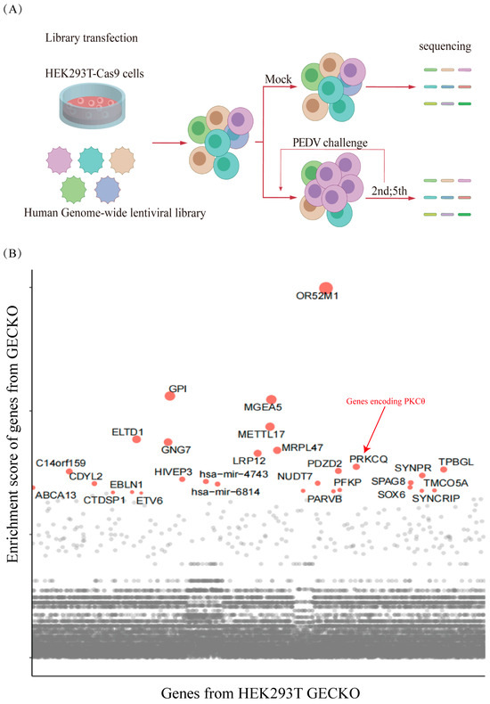 HEK293T-GeCKO libraries were created using the lentiGuide-Puro vector system for Cas9 and sgRNA delivery. First, HEK293T cell clones stably expressing Cas9 components (HEK293T-Cas9) were generated using lentivirus transfection of the Cas9 transgene. Next, HEK293T cells were transfected with a lentivirus human gRNA library targeting 20,914 genes, using an MOI of 0.3 to ensure the delivery of a single viral construct to most cells. After 48 hpi, transfected HEK293T-Cas9 cells were selected by culturing with 2 μg/mL and 10 μg/mL puromycin (Hyclone, Seattle, WA, USA), respectively, for 2 to 3 days. The cells were then infected with PEDV at an MOI of 0.3. After 24–30 hpi, the cells were washed with PBS (Hyclone, Seattle, WA, USA) to remove dead cells. Subsequently, fresh medium was added to the surviving clones. The cells were cultured in DMEM (Hyclone, Seattle, WA, USA) supplemented with 10% FBS (PAN-Biotech, Aidenbach, Germany) and 1% penicillin-streptomycin solution (BasalMedia, Shanghai, China), and they were subjected to five successive rounds of PEDV infection. The cells became resistant to viral infection after these rounds of infection. At the end of the screening, the surviving resistant cells were expanded and analyzed using deep sequencing analysis by Sangon Biotech Company (Shanghai, China).