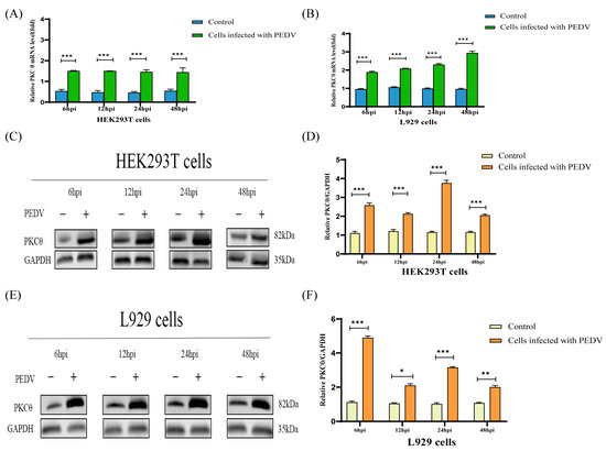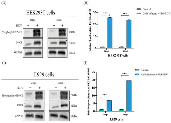 PEDV infection increases PKCθ expression and phosphorylation in HEK293T and L929 cells. (A) qRT-PCR analysis of PKCθ mRNA levels in HEK293T and PEDV-infected HEK293T cells (MOI = 1) at 6, 12, 24, and 48 hpi. (B) qRT-PCR analysis of PKCθ mRNA levels in L929 and PEDV-infected L929 cells (MOI = 1) at 6, 12, 24, and 48 hpi. (C,D) Western blot analysis of PKCθ protein levels in HEK293T and PEDV-infected HEK293T cells (MOI = 1) at 6, 12, 24, and 48 hpi; changes in the PKCθ/GAPDH ratio were quantified using ImageJ software version 1.57 and plotted. (E,F) Western blot analysis of PKCθ protein levels in L929 and PEDV-infected L929 cells (MOI = 1) at 6, 12, 24, and 48 hpi; changes in the PKCθ/GAPDH ratio were quantified using ImageJ software version 1.57 and plotted. (G,H) Western blot analysis of phosphorylated PKCθ protein levels in HEK293T and PEDV-infected HEK293T cells (MOI = 1) at 24 and 48 hpi; changes in the phosphorylated PKCθ/GAPDH ratio were quantified using ImageJ software version 1.57 and plotted. (I,J) Western blot analysis of phosphorylated PKCθ protein levels in L929 and PEDV-infected L929 cells (MOI = 1) at 24 and 48 hpi; changes in the phosphorylated PKCθ/GAPDH ratio were quantified using ImageJ software version 1.57 and plotted. “*” means p ≤ 0.05; “**” means p ≤ 0.01; “***” means p ≤ 0.001.