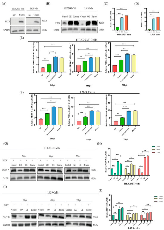 Knockout or overexpression and rescued overexpression of PKCθ inhibits or facilitates PEDV replication, respectively. (A) Western blot analysis of PKCθ-knockout HEK293T and L929 cells. (B–D) Western blot analysis of overexpression and rescued overexpression of PKCθ; changes in the PKCθ/GAPDH ratio were quantified using ImageJ software version 1.57 and plotted. (E) qRT-PCR analysis of PEDV-S RNA levels in PKCθ-knockout PEDV-infected HEK293T cells (MOI = 1), PEDV-infected HEK293T cells (MOI = 1), PKCθ-overexpressing PEDV-infected HEK293T cells (MOI = 1), and PKCθ-rescued overexpressing PEDV-infected HEK293T cells (MOI = 1) at 24, 48, and 72 hpi. (F) qRT-PCR analysis of the levels of PEDV-S RNA in PKCθ-knockout PEDV-infected L929 cells (MOI = 1), PEDV-infected L929 cells (MOI = 1), PKCθ-overexpressing PEDV-infected L929 cells (MOI = 1), and PKCθ-rescued overexpressing L929 cells (MOI = 1) at 24, 48, and 72 hpi. (G,H) Western blot analysis of PEDV-N protein levels in PKCθ-knockout PEDV-infected HEK293T cells (MOI = 1), PEDV-infected HEK293T cells (MOI = 1), PKCθ-overexpressing PEDV-infected HEK293T cells (MOI = 1), and PKCθ-rescued overexpressing HEK293T cells (MOI = 1) at 24, 48, and 72 hpi; changes in the PEDV-N/GAPDH ratio were quantified using ImageJ software version 1.57 and plotted. (I,J) Western blot analysis of PEDV-N protein levels in PKCθ-knockout PEDV-infected L929 cells (MOI = 1), PEDV-infected L929 cells (MOI = 1), PKCθ-overexpressing PEDV-infected L929 cells (MOI = 1), and PKCθ-rescued overexpressing PEDV-infected L929 cells (MOI = 1) at 24, 48, and 72 hpi; changes in the PEDV-N/GAPDH ratio were quantified using ImageJ software version 1.57 and plotted. “*” means p ≤ 0.05; “**” means p ≤ 0.01; “***” means p ≤ 0.001, “ns” means not significant.