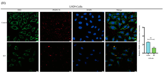 The life cycle of PEDV includes absorption, endocytosis, replication, and propagation [39]. To investigate the role of PKCθ in the absorption and endocytosis of PEDV, PKCθ-knockout HEK293T and L929 cells were infected with PEDV (MOI = 1). The cells were either kept at 4 °C for 1 hpi to assess absorption or shifted to 37 °C for 1 hpi to evaluate viral entry. There were no observable differences in the RNA copies and titer of absorbed virions in PKCθ-knockout HEK293T and L929 cells compared to those in uninfected cells, as determined through qRT-PCR and TCID50 analyses (Figure 5A–D). However, the RNA copies of internalized virions were significantly decreased in PKCθ-knockout 293T and L929 cells compared to those in uninfected cells (Figure 5E,F). Confocal imaging also showed consistent results (Figure 5G,H). These results indicate that PKCθ is involved in PEDV endocytosis rather than absorption.