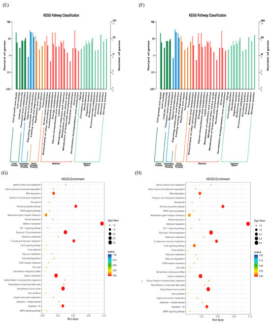 Total RNA was extracted using TRIzol reagent (TaKaRa, Beijing, China), and its concentration, purity, and integrity were evaluated using a NanoDrop spectrophotometer (Thermo scientific, Waltham, MA, USA). Reverse transcription was performed using 1 μg of total RNA with HiScript II Q RT SuperMix for qPCR (+gDNA wiper) and gDNA eraser (Vazyme, Shanghai, China). The concentration, purity, and integrity of cDNA were evaluated using a NanoDrop spectrophotometer (Thermo scientific, Waltham, MA, USA). The qRT-PCR measurements were conducted using SYBR Green MasterMix (11203ES50, YEASEN, Shanghai, China) and StepOne Software v.2.3 (Applied Biosystems, Carlsbad, CA, USA) with 40 cycles (three biological replicates). Data were analyzed using the ΔΔCt (cycle threshold) method and normalized to the expression of the reference gene, GAPDH. The primer sequences used for qRT-PCR are listed in Table 4.