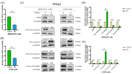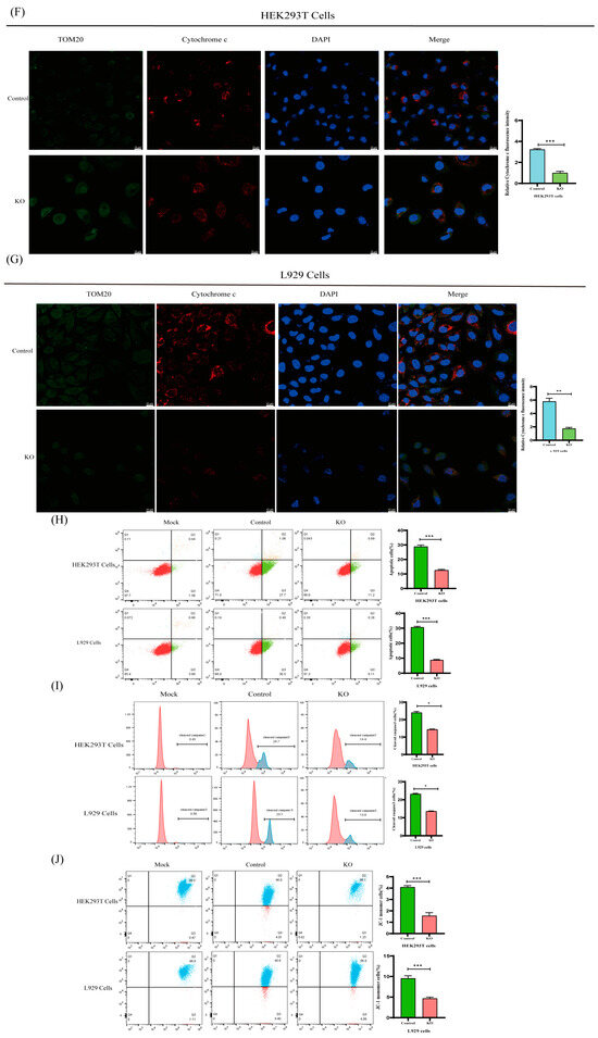 To validate the quality of the RNA-seq data, BOK expression was validated in PKCθ-knockout PEDV-infected HEK293T and L929 cells (MOI = 1) at 48 hpi compared to that in PEDV-infected HEK293T and L929 cells (MOI = 1) using qRT-PCR and Western blot analysis (Figure 7A,B). The results indicate that the levels of RNA copies and BOK proteins were reduced in PEDV-infected PKCθ-knockout HEK293T and L929 cells compared to the control group. The levels of leaked cytochrome c, BOK, cleaved-caspase9, pro-caspase 3, cleaved-caspase 3, and cleaved PARP1 were examined in PKCθ-knockout PEDV-infected HEK293T and L929 cells (MOI = 1) at 48 hpi compared to the control group using confocal imaging and Western blotting (Figure 7C–G). The results indicate that PEDV-infected PKCθ-knockout HEK293T and L929 cells had decreased levels of these proteins compared to the control group. In addition, to assess changes in apoptotic signal intensity, Annexin V-FITC was used to analyze the percentage of apoptotic cells in PKCθ-knockout PEDV-infected HEK293T and L929 cells (MOI = 1) at 48 hpi compared to PEDV-infected HEK293T and L929 cells (MOI = 1). The percentage of apoptotic cells was determined using Annexin V-FITC analysis via flow cytometry (FACS) (Figure 7H). The proportion of apoptotic cells in PEDV-infected PKCθ-knockout HEK293T and L929 cells was lower than that in the control group. The irreversible loss of mitochondrial membrane potential (ΔΨm) is a significant event in early apoptotic cells [41]. FACS analysis of JC-1 staining revealed a higher proportion of cells with low ΔΨm in the control group than in the PEDV-infected (MOI = 1) PKCθ-knockout HEK293T and L929 cells at 48 hpi (Figure 7I). Additionally, in this study, cleaved caspase 3 was detected in PKCθ-knockout PEDV-infected HEK293T and L929 cells (MOI = 1) at 48 h. Cleaved-caspase 3 activity was lower in PKCθ-knockout PEDV-infected HEK293T and L929 cells than in PEDV-infected HEK293T and L929 cells at 48hpi (Figure 7J). These results indicate that PKCθ knockout affected BOK expression and mitochondrial apoptosis.