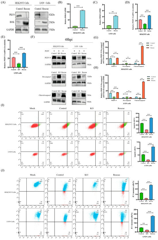 To confirm the effects of PKCθ on PEDV replication via BOK, we first constructed BOK-rescued expression in PKCθ-knockout HEK293T and L929 cells (Figure 8A–C). Next, we assessed the effect of BOK-rescued overexpression in PKCθ-knockout PEDV-infected HEK293T and L929 cells (MOI = 1) at 48 h and compared it with that in PEDV-infected HEK293T and L929 cells, as well as PKCθ-knockout PEDV-infected HEK293T and L929 cells. This was performed using qRT-PCR and Western blot analysis (Figure 8D–H). The results reveal that the levels of RNA copies and virions were significantly higher than those in the control groups. The levels of pro-caspase 3 and cleaved-caspase 3 were assessed using Western blot analysis (Figure 8F–H). The results reveal that the level of pro-caspase 3 was reduced, while the level of cleaved-caspase 3 was increased compared to that in the control groups. Furthermore, the ratio of apoptotic cells to cells with low ΔΨm was assessed using Annexin V-FITC and JC-1 and analyzed using flow cytometry (Figure 8I,J). The results indicate higher percentages of apoptotic cells and cells with low ΔΨm compared to those in the control groups. These data suggest that the PKCθ–BOK axis played a crucial role in PEDV replication via mitochondrial apoptosis.