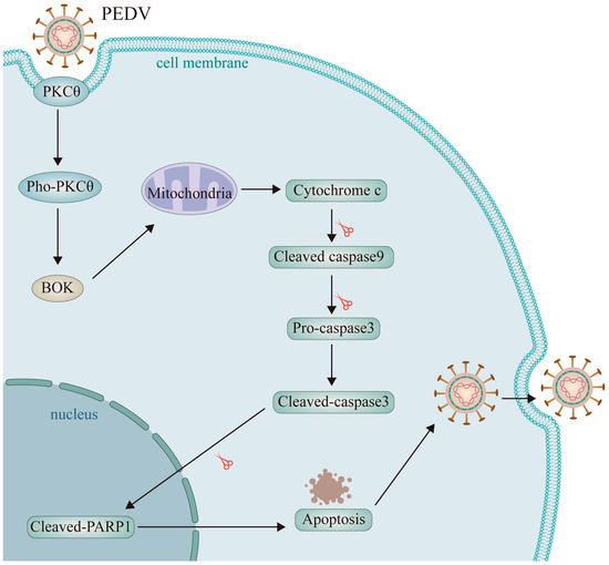 Vero and IPEC-J2 cell lines are frequently used in PEDV research. However, these cell lines exhibit limitations in terms of their immune response and viral replication. Several studies have identified additional cell lines that are susceptible to PEDV infection to address these limitations and to enhance our understanding of PEDV infection. These include rat crypt epithelial cells, primary bovine mesenchymal cells, and IP2-2I cells [10,42,43]. Studies have shown that HEK293 cells are susceptible to PEDV infection [36]. In the present study, we assessed the susceptibility of HEK293T and L929 cells to PEDV infection, based on their robust growth, stable cytokine expression, and efficient transfection capabilities. The results show that both HEK293T and L929 cells were susceptible to PEDV infection, suggesting that these cell models are ideal for investigating PEDV infection in vitro. Additionally, these findings imply that PEDV could pose a potential threat to mammals, especially humans. Notably, receptors and co-receptors required for PEDV infection may have discrepancies among different host cells, raising questions about the validation of these receptors and co-receptors in in vivo studies. We illustrated PEDV endocytosis and replication relies on PKCθ-BOK-caspase3 mitochondrial apoptosis in Figure 9.