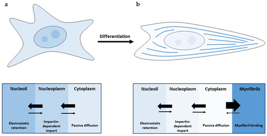 Cardiac troponin I (cTnI) distribution in undifferentiated (a) and muscle (b) cells. (a) cTnI enters the nucleus via importin-dependent import and partially accumulates in the nucleoli via electrostatic interaction with RNA. Diffusion through the nuclear pore complex leads to decreased nuclear accumulation. As a result, cTnI is distributed throughout the cell. (b) Concentration of unbound cTnI decreases in all compartments since it binds to myofilaments with high affinity.