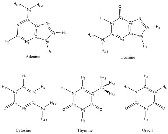 Radiation treatments work by exposing infected cells to high-energy radiation or particles to destroy the DNA and thereby prevent the diseased cells from dividing further [3]. Thus, the radiation of cancer cells leads to two different outcomes: the first one is a positive effect, which consists of a decrease in the rate of division of cancer cells, and the second one is the possible damage of DNA. Either direct radiolysis of DNA is observed or the DNA string is indirectly damaged by radicals generated in the cell by the radiation. The cells in a human body consist mainly of water (70 percent). The radiolysis of water and how it affects DNA is thus of great importance, as the probability of the radiation hitting a water molecule is not negligible [4]. A radiated water molecule decomposes into highly reactive radical species, such as an OH radical [5], and this can cause a reaction with the DNA in the cells, leading to mutations, severe damage of the DNA or the death of the cell. The OH radical can undergo two different reactions with the nucleobases of DNA: a hydrogen abstraction reaction or an addition reaction where the radical adds to the double bonds in the aromatic nucleobases. Both reactions lead to nucleobase radicals, which are highly reactive and eventually lead to strand breaks within the DNA, resulting in mutation in the cell or cell death [6,7]. The nucleobases consist of two purines: adenine and guanine, and three pyrimidines: thymine, cytosine and uracil (found in Ribonucleic Acid (RNA)); see Figure 1. In addition, hydrogen abstraction from the ribofuranose of the nucleosides are possible [8]. Even though the OH radical reacts aggressively with organic compounds, it is short-lived; thus, to react with DNA the OH radical must be adjacent to the DNA string [9]. Experiments have shown that the indirect reaction through water occurs 60–70 percent of the time, which is why it is of great importance to improve knowledge about such reactions [4].
