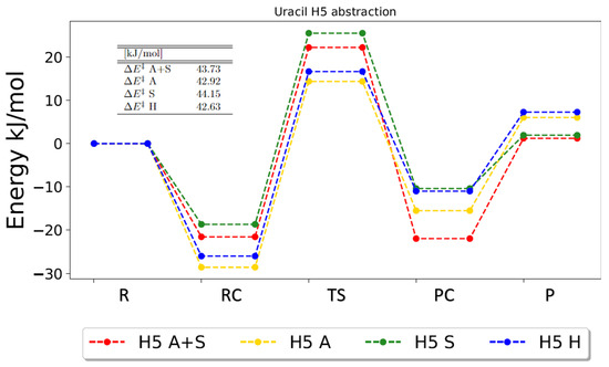 In order to comment on the impact on energetics, potential energy surfaces (PESs) for every reaction pathway and their corresponding zero-point vibrational corrected energies were obtained. These PESs underline the already-discussed tendencies, i.e., that similarities between the gas-phase calculations were observed as well as similarities between the solvent calculations. For every abstraction reaction, the energetics for the gas-phase calculations seem to be in best agreement with each other, and the energetics for the solvent calculations agree best. This is illustrated for the abstraction of H5 in Figure 2, where the energetics for gas-phase calculations are similar, and the energetics for PCM calculations are similar. This is the general picture observed for abstractions in uracil, as can be seen from the figures for the other abstraction reactions in Appendix A.