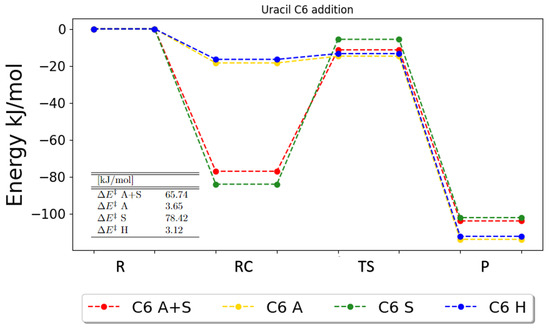 For the addition reactions, the same pattern is observed, as illustrated in Figure 3 for the addition to C6. This is also the general picture of the trend for the other addition reactions in uracil, for which the figures can be found in Appendix A. Furthermore, it should be noted that the solvent calculations have a higher forward barrier compared to the gas-phase calculations; thus, a lower reaction rate is to be expected.