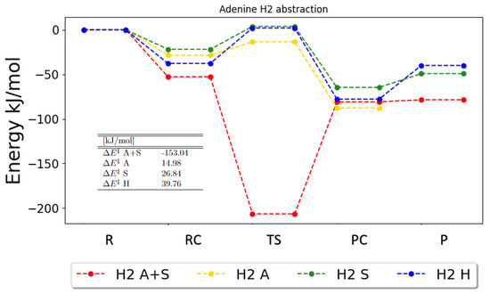 Another contribution to the rate constants is the barrier height. PESs of the zero-point vibrational corrected energies for the different reaction pathways for adenine are therefore discussed in the following. The H2 abstraction reaction, shown in Figure 4, is a special case. For the PCM calculations with anharmonic frequencies (the H2 A+S red graph in Figure 4), the anharmonic zero-point vibrational correction to the energy is much smaller for the transition state than for the reactants, products and reactant and product complexes, which causes the zero-point corrected energy of the transition state to be lower than the corresponding energies of the reactant or product complexes. This implies that neither an Eckart tunneling factor nor a rate constant can be calculated with transition state theory, i.e., from Equation (4). Otherwise, the energetics from the anharmonic, the solvent and the anharmonic and solvent calculations seem to be relatively close for this reaction.