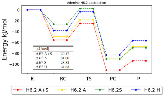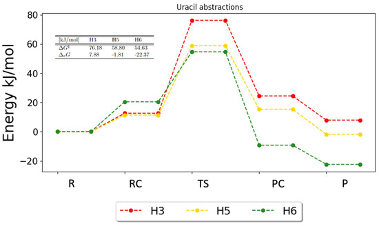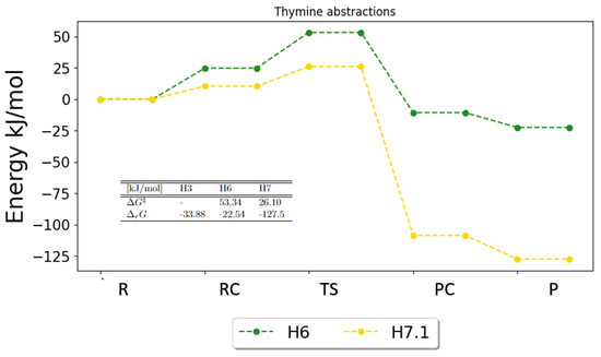 In Figure 9, the PES for thymine is shown. The PES for thymine shows a one-sided picture, that is, one abstraction reaction happens with great probability. Even though no results were obtained for the H3 abstraction, it is clear from the PES that the H7.1 abstraction is favored and dominant. According to the already-discussed literature, the H7.1 abstraction plays the most important role, and it is expected that the H3 abstraction is not likely to change this picture. Both the free activation energy (26.10 kJ/mol) and the free reaction energy (−127.55 kJ/mol) for the H7.1 abstraction are dominant. The free energies of reaction were calculated for every reaction: H3 (−33.88 kJ/mol), H6 (−22.54 kJ/mol) and H7.1 (−127.55 kJ/mol). H7.1 has a significantly much lower free reaction energy and the lowest free energy of activation; thus, this reaction is expected to be the single most important reaction for thymine abstractions.