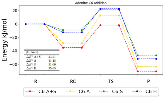In general, for the reactions with adenine, the tendencies for the energetics are that harmonic PCM and harmonic gas phase are in better agreement with one another, and the energies of the anharmonic calculations seem to agree more with each other, i.e., a different pattern than what we saw for uracil. This is very clear for the additions at C4, C5, C6 and C8, where it seems that anharmonicity has a greater impact than the solvent, as illustrated for C6 in Figure 6.