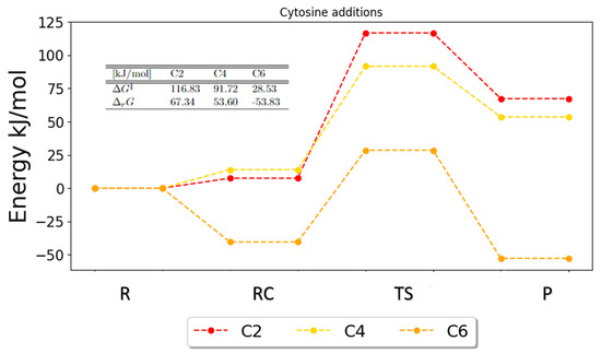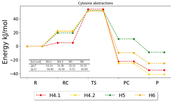 The potential energy surfaces for abstractions in cytosine are shown in Figure 8. Based on these PESs, every reaction is likely to occur, which agrees with the previous conclusions from the analysis of the reaction rate constants. The free energies of activation for H4.2, H5 and H6 are all very close (51.36 kJ/mol, 52.12 kJ/mol and 51.55 kJ/mol, respectively), whereas the activation energy for H4.1 is slightly higher (54.14). The activation energies for every pathway lie in a close interval and based on this, every reaction still seems plausible. The biggest difference is found in the reaction energies, where the abstractions of H4.1 and H4.2 are lowest (−34.92 kJ/mol, −41.01 kJ/mol) and that of H6 is highest (−8.75 kJ/mol). It is unarguable that every reaction might occur, since the product for each abstraction leads to a lower energy, which is preferable. Based on the Gibbs activation and reaction energies, it seems possible that every reaction will contribute to the overall reactions.