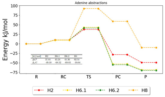 For the purines, only the PES for adenine is shown in Figure 10. The PES for adenine, Figure 10, shows the expected similarities between H6.1 and H6.2. They have similar energy barriers, with activation energies of 43.24 kJ/mol and 41.36 kJ/mol, respectively, showing a slight preference for H6.1 based on the barriers. The lowest activation energy is obtained for H2 (37.81 kJ/mol). For the Gibbs free reaction energies, H6.1 and H6.2 are still comparable, with energies of −68.52 kJ/mol and −69.83 kJ/mol, respectively, which show a slight preference for H6.2. The reaction energy for H2 is −49.10 kJ/mol, which is smaller than for H6.1 and H6.2, so even if H2 obtained the lowest barrier, this reaction is not expected to be the most preferred due to the reaction energy. The abstraction of H8 is very unlikely to happen, since the energy from reactant to reactant complex is extremely high and, furthermore, there is a very small reaction energy (−10.04 kJ/mol) and therefore, little gain for the reaction. Based on the PES, abstraction of the amine H6.1 and H6.2 are most likely to occur and abstraction of H2 is plausible as well. Abstraction of H8 seems very unlikely. This agrees with what was found for the reaction rates.