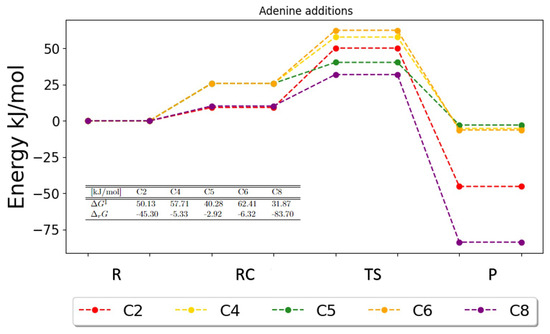 In 2010, Cheng et al. [35] showed the importance of the different dehydrogenating reactions for adenine in a study concerning the hydroxyl reaction with adenine employing B3LYP/DZP++ level of theory. Optimized geometries, harmonic vibrational frequencies, natural populations and intrinsic reaction coordinate (IRC) calculations were performed. The study states that, except for C8 radical attack, the hydroxyl attacks all other sites that lead to dehydrogenation, spontaneously forming the adenine radical and water. H6.2 was found to be the most kinetically favorable.