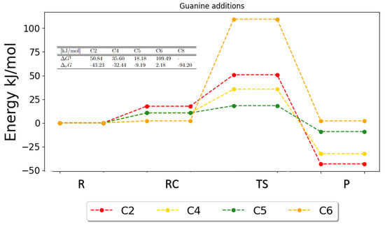 It should be noted that the thermodynamic aspects of these reactions and conclusions based upon thermodynamics are only slightly relevant, since the products are highly reactive and will likely react further with oxidants or other molecules in the environment. This has been investigated in multiple studies, and Naumov and von Sonntag [36] stated that reactions between the OH radical and nucleobases are likely to be kinetically controlled rather than by thermodynamics, since thermodynamic equilibrium is not upheld and thus, they undergo tautomerization reactions, water elimination reactions and rearrangement reactions.