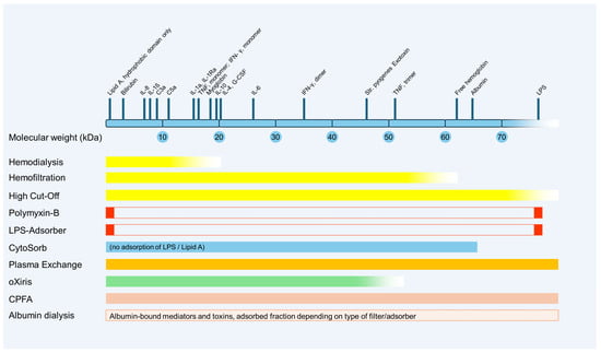 Schematic representation of potential clearance properties of blood purification methods based on the molecular weight of various mediators and toxins. CPFA, coupled plasma filtration adsorption; G-CSF, granulocyte-colony stimulating factor; IFN, interferon; IL, interleukin; kDa, kilodalton; LPS, lipopolysaccharide; TNF, tumor necrosis factor.