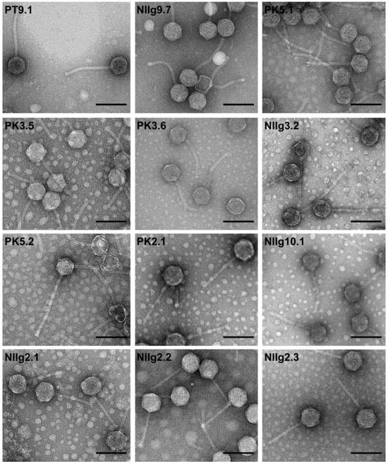 - Turner, D.; Shkoporov, A.N.; Lood, C.; Millard, A.D.; Dutilh, B.E.; Alfenas-Zerbini, P.; van Zyl, L.J.; Aziz, R.K.; Oksanen, H.M.; Poranen, M.M.; et al. Abolishment of Morphology-Based Taxa and Change to Binomial Species Names: 2022 Taxonomy Update of the ICTV Bacterial Viruses Subcommittee. Arch. Virol. 2023, 168, 74. [Google Scholar] [CrossRef]