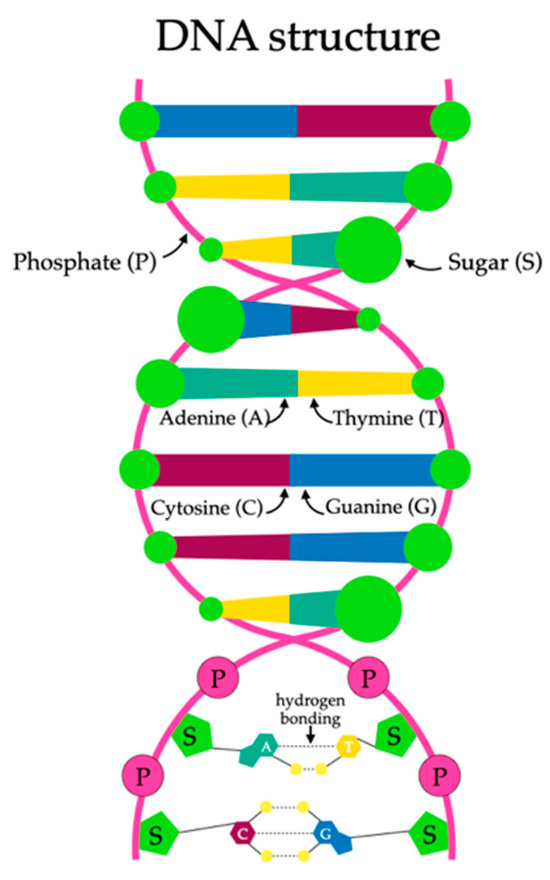 DNA, or deoxyribonucleic acid, constitutes the fundamental unit of genetic inheritance in all known organisms [125]. It is a complex biopolymer composed of two chains of nucleotides intertwined in a characteristic double helix [126]. Its structure is depicted in the figure below (Figure 4). The function of DNA is not limited solely to the transmission of genetic information, but also holds significance in the context of innovative drug carriers [127].