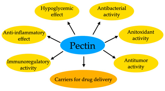 Pectin itself has therapeutic properties (Figure 7). Still, researchers are also conducting research that allows obtaining composite materials by combining this biopolymer with a drug. So, for example, hydrogel composites of pectin/bacterial cellulose (BC) with varying BC content were constructed for controlled drug delivery utilizing the conductive polymer polypyrrole. Incorporating polypyrrole allowed drug encapsulation within the pectin/BC composite, enabling controlled release under the influence of an electric field. The release of ibuprofen, serving as a model drug, was investigated, considering the matrix composition, pH stimulation, matrix pore size, and applied electrical potential using a modified Franz diffusion cell. Optimal drug release conditions were achieved at 30% BC by weight, and release increased with applied electrical potential. The highest release efficiency, reaching 78%, was attained for the composite containing polypyrrole under a potential of 7 V. Additionally, the hydrogel composites exhibited significant antibacterial properties against Gram-positive bacteria. These results underscore the potential of pectin/BC hydrogel composites for transdermal drug delivery. The research by the team led by Nattinee Krathumkhet [167] has yielded promising outcomes, opening new avenues for investigations into pectin-based materials for transdermal drug delivery purposes.