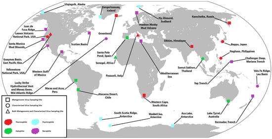 Ever since the discovery of non-living biological entities infecting tobacco plants by Dimitri Ivanovski and Martinus Beijerinck, the field of virology has expanded extensively to encompass viruses that infect all forms of life [,,,]; furthermore, viruses, being the most abundant biological entity on the planet, have been found in many different locales across the globe [,] (Figure 1). Historically, the study of viruses has relied on the cultivation of a host cell and the replication of the cell’s requirements within a laboratory setting. This also requires the extraction of viable virions from the environment or samples collected from the environment [,,,]. This presents its own set of challenges, as these viruses must be infectious for there to be enough viable sample to study. This viability also extends to the cells themselves as they must be able to replicate to produce viral progeny for study. Unfortunately, this can limit the scope of viral studies as many host cells are unculturable in the lab and, thus, the viruses that infect them cannot be characterized [,]. However, newer technological developments have allowed for the study of viruses without the need for culture-based techniques. Metagenomics has opened a whole new set of environments ripe for study by scientists [,,,,,,]. Through these newer techniques, viruses from environments previously considered impossible to recreate in the lab can be studied. In this review, we focus on viruses from these extreme locales. We hope to emphasize some of the unique properties they have and shed light on some of the more novel aspects of virology.