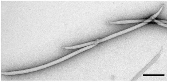 Sulfolobus filamentous virus 1 (SFV1). SFV1 was isolated from samples of Sulfolobus shibatae from the acidic hot springs of Umi Jigoku located in Beppu, Japan. The terminal mop-like structures are also visible. Some viruses were seen with elongated versions of these mop-like structures, reaching up to 700 nm in length. Reprinted from []. Scale bar = 200 nm.