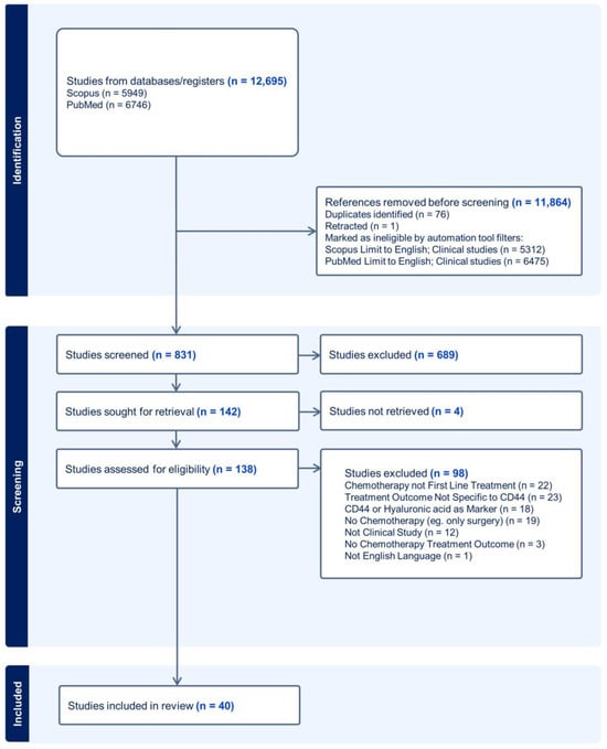 While many in vitro and animal studies have shown that CD44 confers chemoresistance, the relationship between CD44 and chemotherapy treatment outcomes in cancer patients is ambiguous [20]. Hence, this scoping review aims to systematically review the current clinical literature to elucidate the impact of CD44 on chemotherapy treatment outcomes in cancer patients, addressing the existing uncertainties in this vital area of cancer research.