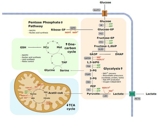 Schematic representation of the metabolic fate of glucose in a tumoral cell. Warburg effect or aerobic glycolysis involves the conversion of glucose into pyruvate and subsequently into lactate, despite cancer cells possessing a fully functional respiratory chain. Enhanced glycolytic pathway not only results in increased lactate and proton secretion to the extracellular compartment but also increases the availability of glycolysis intermediates. This fact allows the increased flow of substrates to the pentose phosphate pathway (PPP) and one-carbon cycle, promoting nucleotide and lipid synthesis and maintaining redox homeostasis. (1,3-biPG: 1,3-biphosphoglycerate; 2-PG: 2-phosphoglicerate; 3-PG: 3-phosphoglicerate; ADP: adenosine diphosphate; aKG: alpha-ketoglutarate; ALDO: aldolase; ATP: adenosine triphosphate; DHAP: dihydroxyacetone phosphate; ENO: enolase; FAD+: flavin adenine dinucleotide; G6PD: glucose-6-phosphate dehydrogenase; GA3P: glyceraldehyde 3-phosphate; GAPDH: glyceraldehyde 3-phosphate; GDP: Guanosine diphosphate; GLUT1: glucose transporter 1; GSH: glutathione; GTP: Guanosine triphosphate; HCy: homocysteine; HK: hexokinase, LDH: lactate dehydrogenase; MCT4: monocarboxylate transporter 4; Met: methionine; NAD+: nicotinamide adenine dinucleotide; NADP: nicotinamide adenine dinucleotide phosphate; OAA: oxaloacetic acid; PEP: phosphoenolpyruvate; PFK: phosphofructokinase; PGAM: phosphoglycerate mutase; PGI: phosphoglucoisomerase; PGK: phosphoglycerate kinase; PK: pyruvate kinase; SucCoa: succinyl-coA; THF: Tetrahydrofolate).