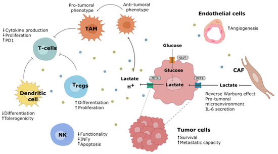 Metabolic characteristics in the microenvironment control macrophage phenotypes and functions [42]. Tumor-derived lactic acid is able to polarize tumor-associated macrophages (TAMs) towards an anti-inflammatory/immune-suppressive phenotype, thereby promoting tumor maintenance and growth [43]. Conversely, macrophage polarization can trigger metabolic shifts in the macrophages [42]. In oral squamous cell carcinoma, a positive feedback loop between tumoral cells and macrophages has been observed in which tumor-derived lactic acid induces the synthesis of glycoprotein non-metastatic protein B in macrophages and that, in turn, acts as a paracrine molecule facilitating tumor migration and invasion [44]. Macrophages also possess the ability to suppress T-cell recruitment and regulate other aspects of tumor immunity [45]. High lactate levels also prevent monocytes from differentiating into mature dendritic cells and promote a tolerogenic phenotype, leading to the secretion of immunosuppressive cytokines [46]. Additionally, T-cells and natural killer (NK) cell functionality is impaired by lactic acidosis. Activated T-cells, which heavily rely on glycolytic metabolism, are adversely affected in the TME due to low glucose and high lactate concentrations, compromising their anti-tumor activity. Furthermore, extracellular acidification suppresses CD8+ T-cell functionality through p38/JNK pathway inhibition and reduces INFy production and secretion [47]. Lactic acidosis also suppresses the anti-tumoral activity of NK cells through the mTOR pathway inhibition [48]. However, regulatory T-cells have been shown to be highly resistant to increased extracellular lactate levels and low pH, maintaining their survival and immunosuppressive role by upregulating the expression of FOXP3 [49]. Lactic acidification of the TME diminishes immunosurveillance and promotes a favorable environment for tumor progression.
