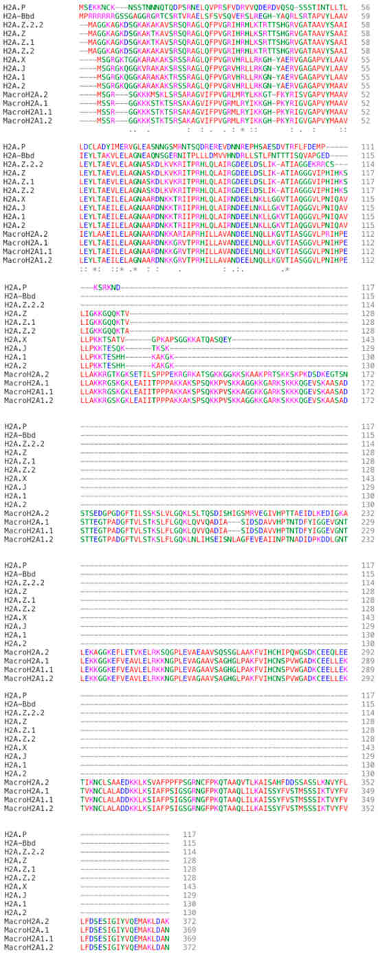| H2A | H2A.X H2A.Z, H2A.Z.1, H2A.Z.2, H2A.Z.2.2 macroH2A: macroH2A1, macroH2A1.1, macroH2A.1.2, macroH2A2 shortH2A (sH2A): H2A.R, H2A.Bbd/H2A.B, H2A.L/H2A.L.1, H2A.P, H2A.Q H2A.L.2, H2A.L.3 H2A.22/H2A.J H2A.1, H2A.2 |