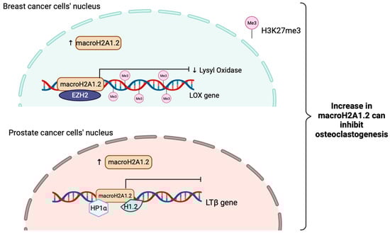 | MacroH2A1.2 | 1. Promote cancer cell proliferation, migration and metastasis in melanoma | 1. Inhibit breast cancer induced osteoclastogenesis by repressing LOX gene through raising H3K27me3 level for gene silencing 2. Inhibit prostate cancer induced osteoclastogenesis by direct interactions with HP1α and H1.2, inactivate LTβ gene |