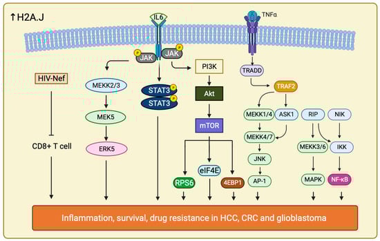 | H2A.22 (H2A.J) | / | 1. Modulate estrogen and metastasis-regulated genes in ER-positive breast and prostate cancers 2. Causing chemoradiotherapy resistance in CRC through regulating MAPK7, HIV Nef pathway and inflammatory pathways 3. Causing chemotherapy resistance in HCC through accelerating PI3K/Akt and JAK/STAT; TNF-α/NF-κB, EMT and IL-6/STAT3 signaling pathway to control cell proliferation, migration and anti-apoptosis response 4. Causing radiotherapy and drug resistance in glioblastoma through activating TNF-α/NF-κB pathways, contacting with IL-6/STAT3 and HDAC3 |