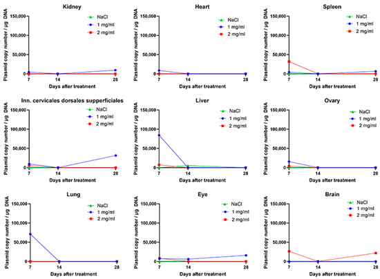 The results from the copy number analysis showed that plasmid DNA was distributed in all organs on day 7, except in subiliac lymph nodes. Depending on the concentration of plasmid used, the amount of plasmid DNA varied in different organs. The highest number of plasmid copies was observed 7 days after the procedure in the liver and lung of the 1 mg/mL group and in the spleen of the 2 mg/mL group. In all of these organs, the number of plasmids diminished over time and was minimal 28 days after the procedure. Additionally, the presence of plasmid DNA in the ovaries was not detected from day 14. Similar results to those observed in the ovary were observed in the heart, superficial dorsal cervical lymph node, and kidney. In the case of the eyes and brain, the plasmid DNA persisted at the same amount throughout the observation period, in the case of the brain in the 2 mg/mL group and in the case of the eye in the 1 mg/mL group (Figure 2).