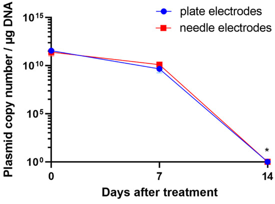 To determine whether plasmid DNA was retained at the injection site, skin swabs were collected from the phIL12 GET areas using a 2 mg/mL plasmid concentration. The plasmid was detected on day 0, just after phIL12 GET, and on day 7, but not on day 14 after GET. Namely, on day 14, the plasmid copy number was no longer significantly different from the values of the control negative skin swab. There was no significant difference between the electrodes, plate, or needle used at any of the analyzed time points (Figure 3). Skin swab analysis showed that the plasmid was not retained on the skin surface.