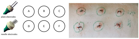 The animals were divided into three groups with different plasmid DNA concentrations (phIL12) [28]: 0 mg/mL (0.9% NaCl), 1 mg/mL, and 2 mg/mL. The IL-12 GET was performed one time only on day 0 on 6 different areas measuring 1 cm in diameter (A–F) on the right flank of the animal (Figure 4). The upper three spots (A–C) were treated using noninvasive plate electrodes (with the distance between plates being 8 mm) and the lower spots (D–F) were treated with invasive needle electrodes (needle rows of a 4 mm distance) (Figure 4). Briefly, 0.5 mL of the plasmid DNA solution or NaCl was injected intradermally, and immediately afterwards, electric pulses (8 pulses, 1300 V/cm, 100 μs, 5 kHz) were applied using a generator of electric pulses (CliniporatorTM, IGEA s.r.l., Carpi, Italy). In total, the pigs receiving 1 mg/mL plasmid DNA on one spot received 3 mg of plasmid and the pigs receiving 2 mg/mL plasmid DNA per spot received a total of 6 mg of plasmid DNA. After GET, sutures were made in the centers of the plasmid injection to mark the treated areas for longer time intervals (Figure 4).