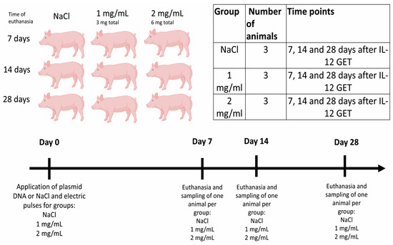 Pigs have already been shown to be a good model for human metabolic, cardiovascular, and infectious diseases, xenotransplantation, neurological disorders, and oncology studies. The main purpose of this study was therefore to support and confirm the non-clinical phIL12 GET data for the ongoing phase I clinical trials. In particular, this study was designed to collect additional data on the safety of the IL-12 GET procedure as recommended for the clinical development of the new drug [26,29]. We decided on a porcine model, as pigs can serve as a valuable model for human IL-12 safety studies due to high homology between human and porcine IL-12 (over 85%) [30].