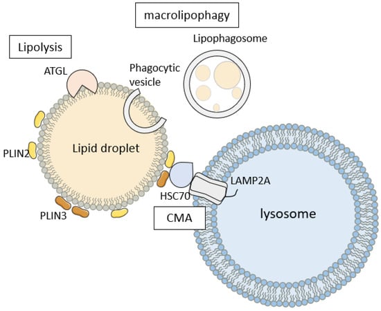 In fact, PLIN2 and PLIN3 are also important target proteins of molecular chaperone-mediated lipid-droplet autophagy, with their spatial structures containing CMA recognition sequences (KFERQ). Under stress conditions, PLIN2 and PLIN3, with their KFERQ-like sequences, are recognized by HSC70, facilitating their translocation to lysosomes for degradation. This alleviates the restriction on lipid-droplet breakdown, allowing autophagic machinery or lipases direct contact with neutral lipids inside LDs, promoting subsequent lipophagy or lipolysis [] (as shown in Figure 2). In contrast, hindering the HSP70 recognition of PLINs or knocking out LAMP2A results in reduced contact between lysosomes and lipid droplets and increased lipid-droplet accumulation in liver cells [,], suggesting that CMA might be a prerequisite for lipolysis and macrolipophagy.