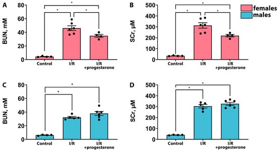 Effects of progesterone treatment on the severity of AKI in female and male rats. BUN concentration in serum of female (A) and male (C) rats 24 h after I/R. SCr concentration in serum of female (B) and male (D) rats 24 h after I/R. * p < 0.05 (one-way ANOVA with Tukey’s multiple comparison test).