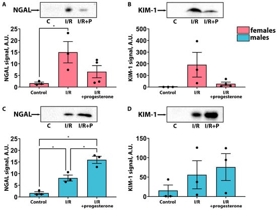 Influence of progesterone treatment on kidney injury markers in female and male rats. NGAL level in the urine of female (A) and male (C) rats 24 h after I/R measured via Western blotting. KIM-1 level in the urine of female (B) and male (D) rats 24 h after I/R measured via Western blotting. * p < 0.05 (one-way ANOVA with Tukey’s multiple comparison test or Kruskal–Wallis test with Dunn’s multiple comparison test).