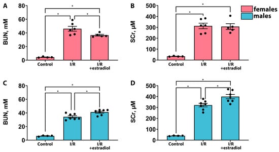 Effects of estradiol therapy on the severity of AKI in the female and male rats. BUN concentration in serum of female (A) and male (C) rats 24 h after I/R. SCr concentration in serum of female (B) and male (D) rats 24 h after I/R. * p < 0.05 (one-way ANOVA with Tukey’s multiple comparison test).