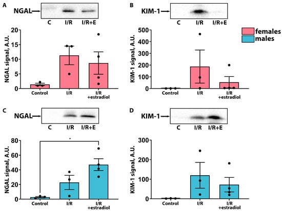 Influence of estradiol therapy on kidney injury markers in female and male rats. NGAL level in the urine of female (A) and male (C) rats 24 h after I/R measured via Western blotting. KIM-1 level in the urine of female (B) and male (D) rats 24 h after I/R measured va Western blotting. * p < 0.05 (one-way ANOVA with Tukey’s multiple comparison test or Kruskal–Wallis test with Dunn’s multiple comparisons).
