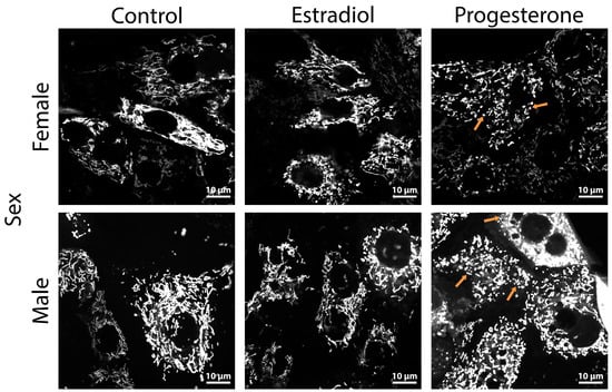 Mitochondrial structure in RTCs from female and male rats incubated with estradiol or progesterone. Representative confocal images of primary RTC cultures loaded with TMRE. Orange arrows point out mitochondrial fragmentation. Scale bar: 10 μm.